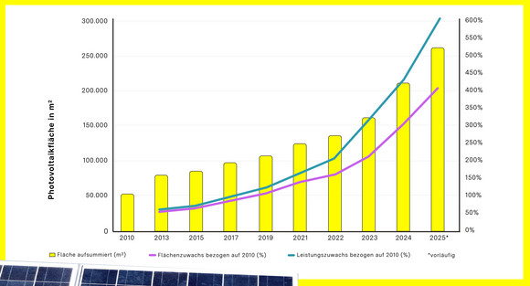 Bis Ende 2025 war eine Photovoltaikfläche von über 261.000* Quadratmetern installiert. In den kommenden Jahren soll die Photovoltaik-Fläche auf Landesliegenschaften noch schneller wachsen. Bis Ende 2030 sollen mindestens 600.000 Quadratmeter Photovoltaikfläche installiert sein.