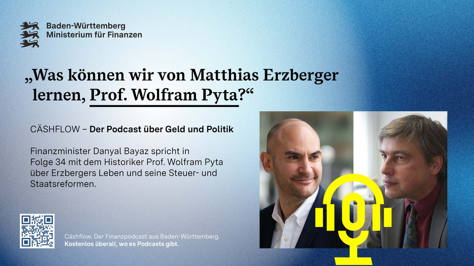 Finanzminister Danyal Bayaz spricht mit dem Historiker Prof. Wolfram Pyta über Erzbergers Leben, seine Steuer- und Staatsreformen und den Mut, in schwierigen Zeiten Verantwortung zu übernehmen. Es geht um Mut, Verantwortung und die Frage, was Erzbergers Vermächtnis uns heute lehrt.