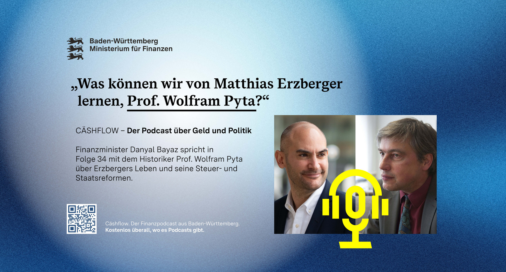 Vor 150 Jahren wurde Matthias Erzberger geboren: Architekt des modernen Steuerrechts, Wegbereiter der deutschen Demokratie, ermordet wegen seiner Überzeugungen. Minister Danyal Bayaz spricht mit dem Historiker Prof. Wolfram Pyta über Erzbergers Leben, seine Steuer- und Staatsreformen und den Mut, in schwierigen Zeiten Verantwortung zu übernehmen. Es geht um Mut, Verantwortung und die Frage, was Erzbergers Vermächtnis uns heute lehrt.